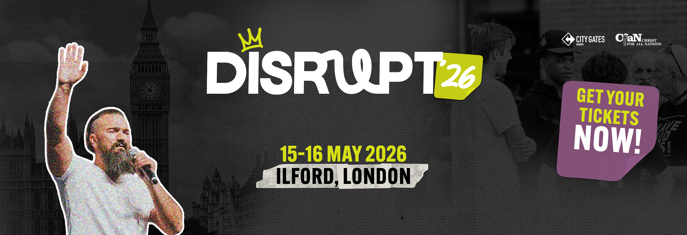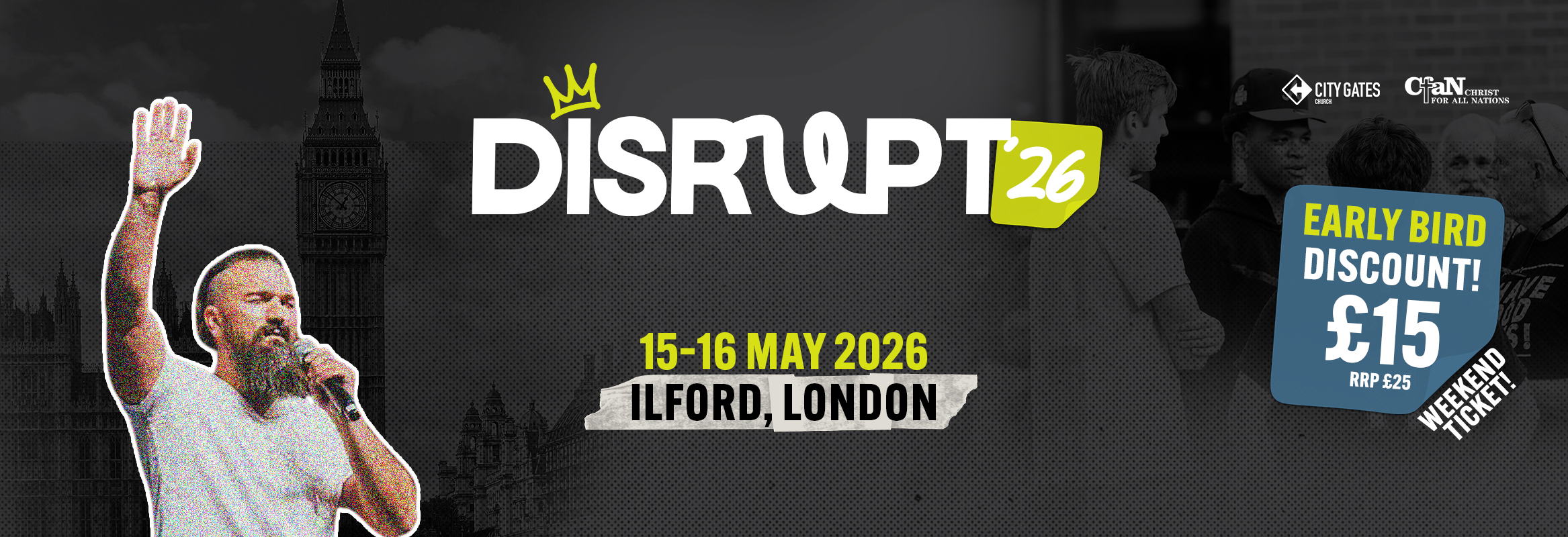 Join us for DISRUPT ’26, a two-day gathering in partnership with City Gates Church, Ilford - designed to awaken, equip, and mobilise believers to live boldly for Jesus. With Eric Gilmour as the main speaker, the heart of the weekend is intimacy with Jesus - creating room for genuine encounters with the Holy Spirit that mark lives, restore hearts, and awaken a deeper hunger for God.